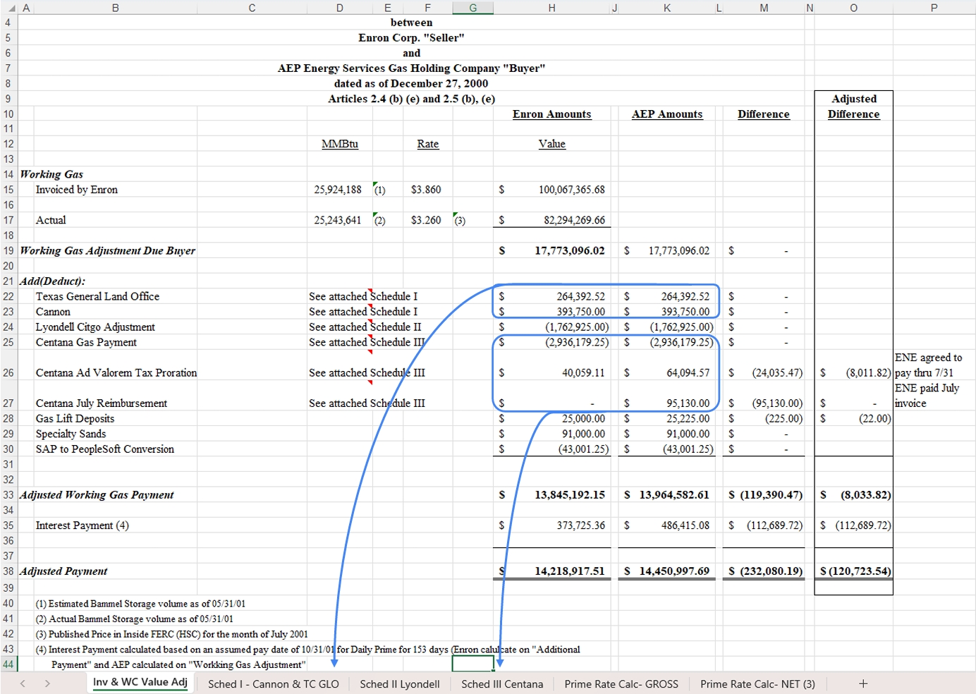 Example 1: Review the Inv & WC Value Adj summary tab and add the missing crossβsheet data references to the other worksheets so the rollβup pulls the correct figures. Return the updated file with those links in place.