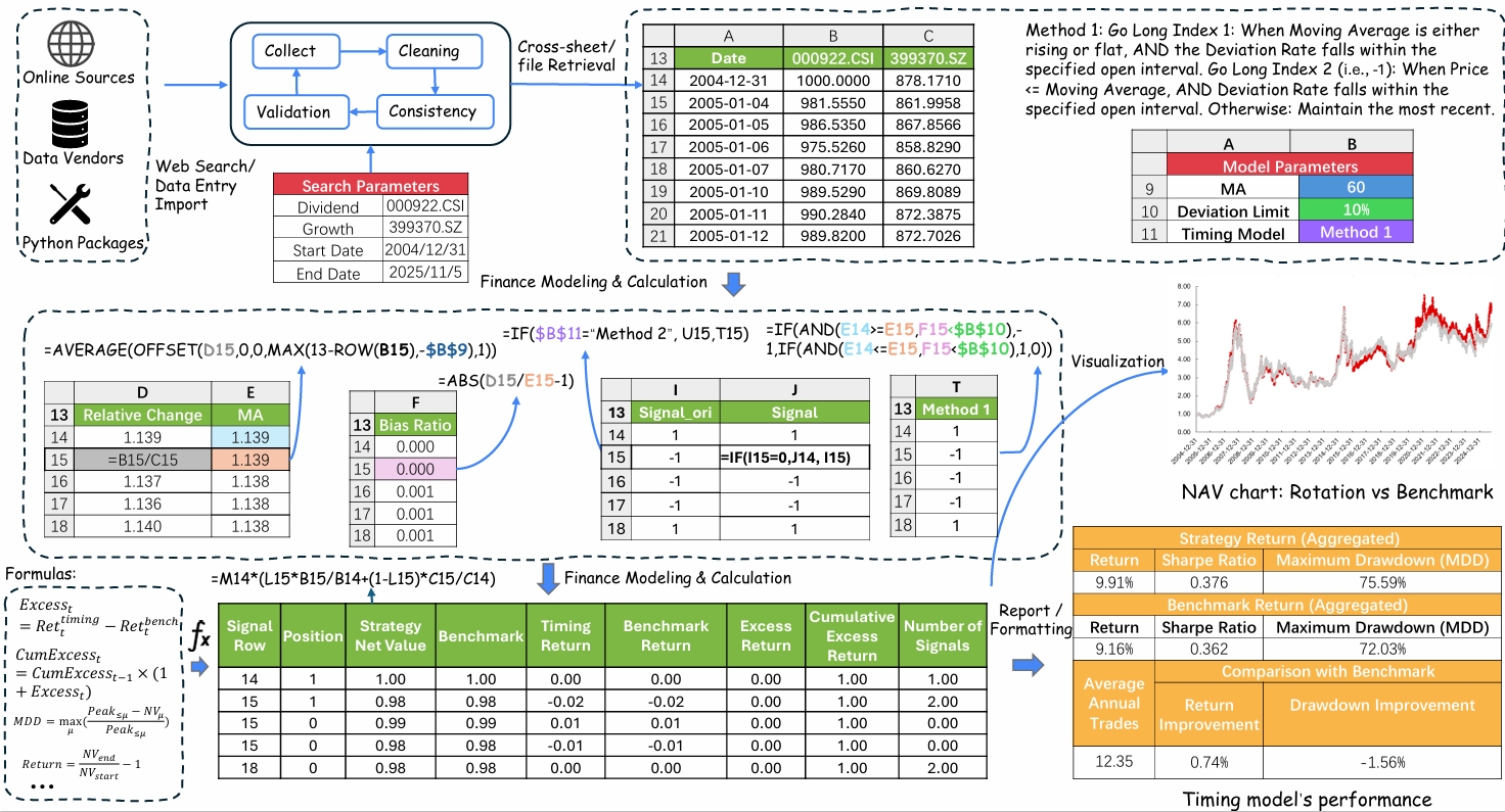 Large, fragmented spreadsheet ecosystems. Workflows routinely span dozens of interlinked workbooks and thousands of rows distributed across many sheets. Executing them accurately requires long-range cross-sheet navigation and precise referencing, which substantially increases the likelihood of small retrieval errors.